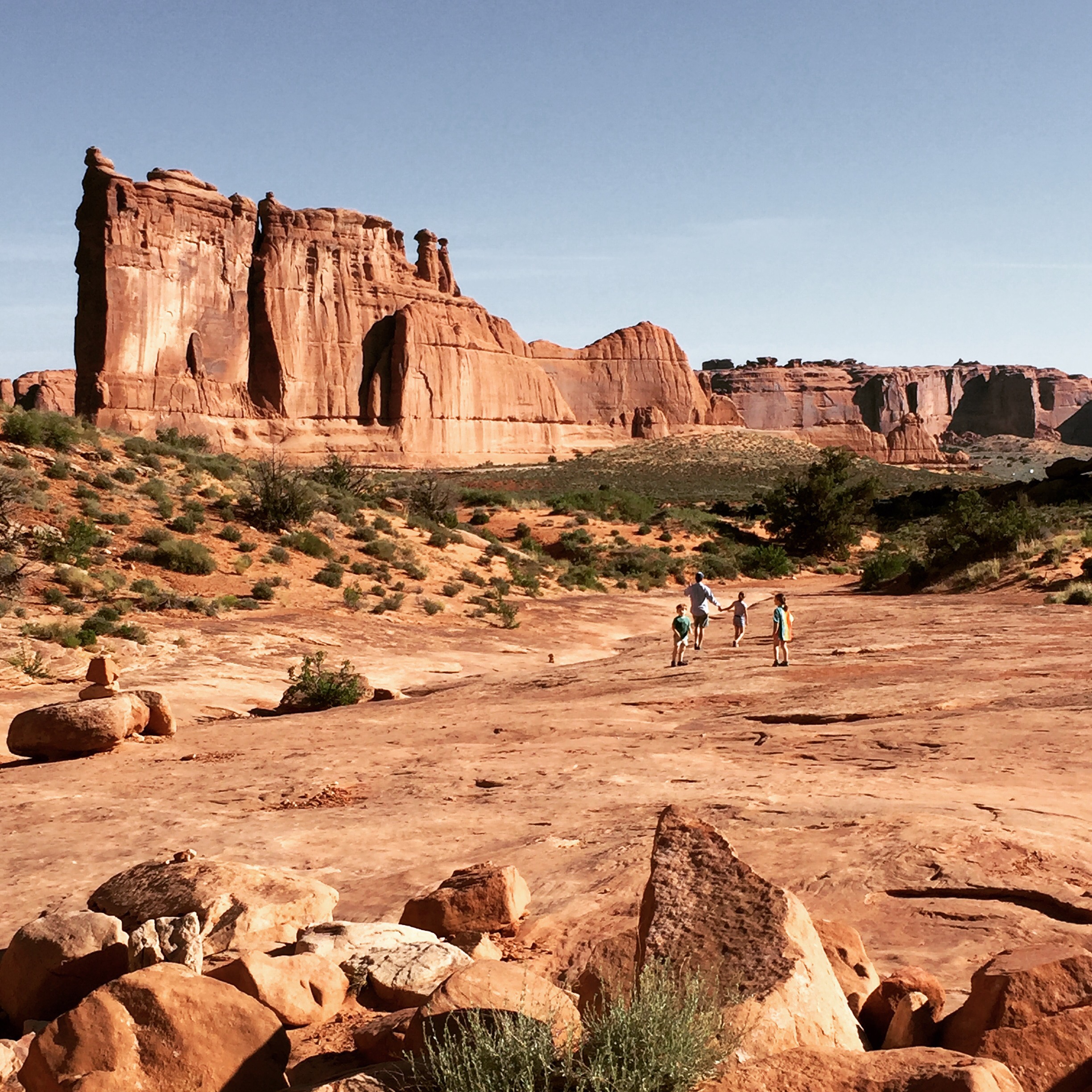 Arches was great for our kids. There were many paved/slick rock trails easy for even the youngest in our group to enjoy. On our first morning there, we woke everyone up early to beat the crowd and hiked Park Avenue, a beautiful little walk surrounded by gigantic sheathes of red rock and bolder fields. The only thing that slowed us down were the two kiddos intent on writing in the sand with sticks rather than continuing our hike. We discovered tadpoles in a lone pool, saw a lizard and made out the images of rabbits, whales and other animals in the desert wood and stone along the way. It was a great introduction to the park.