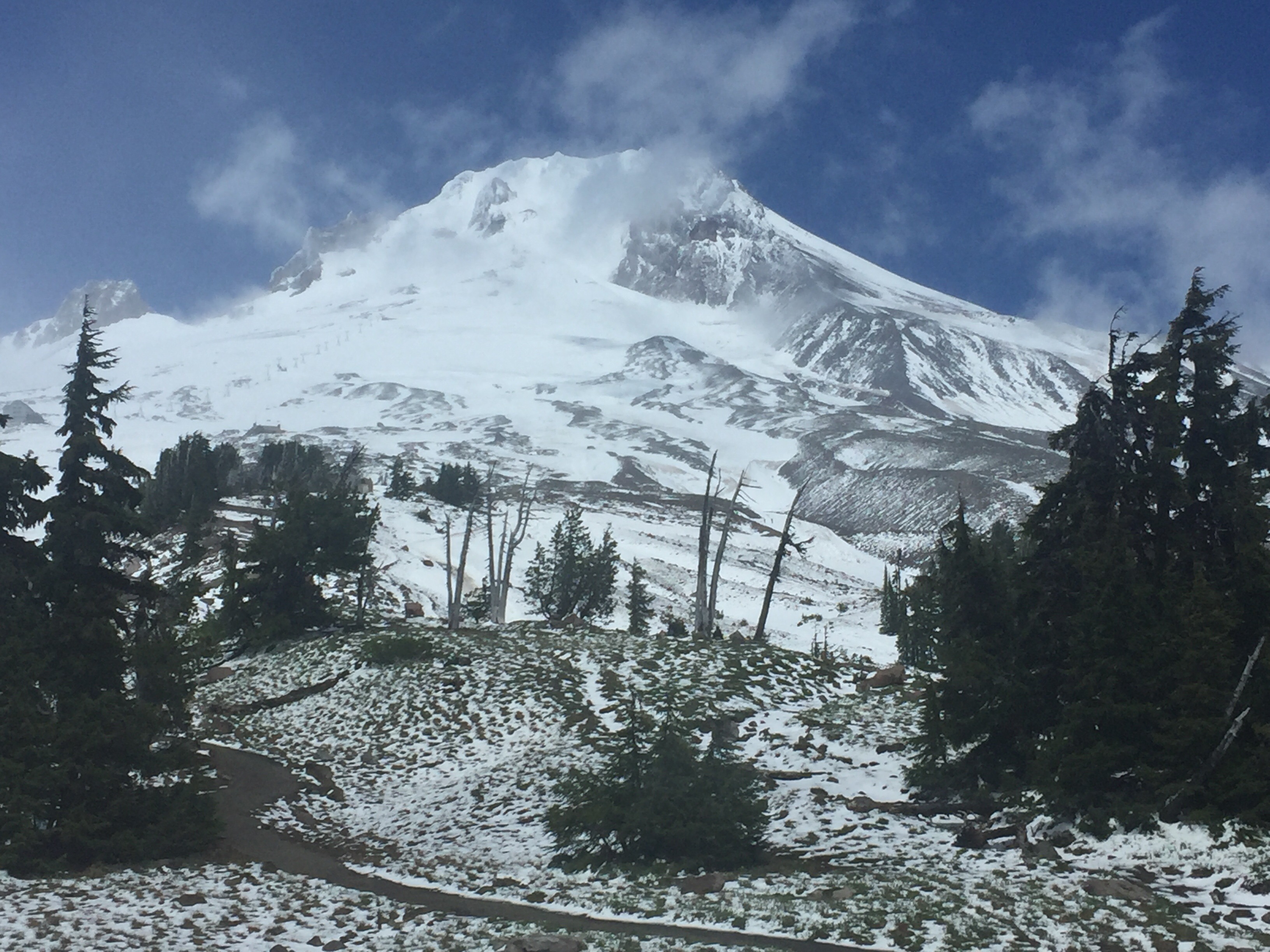 We drove out of high desert and into thick green forests which climbed the eastern Cascades, heading straight for the towering prominence of snow-covered Mt. Hood.