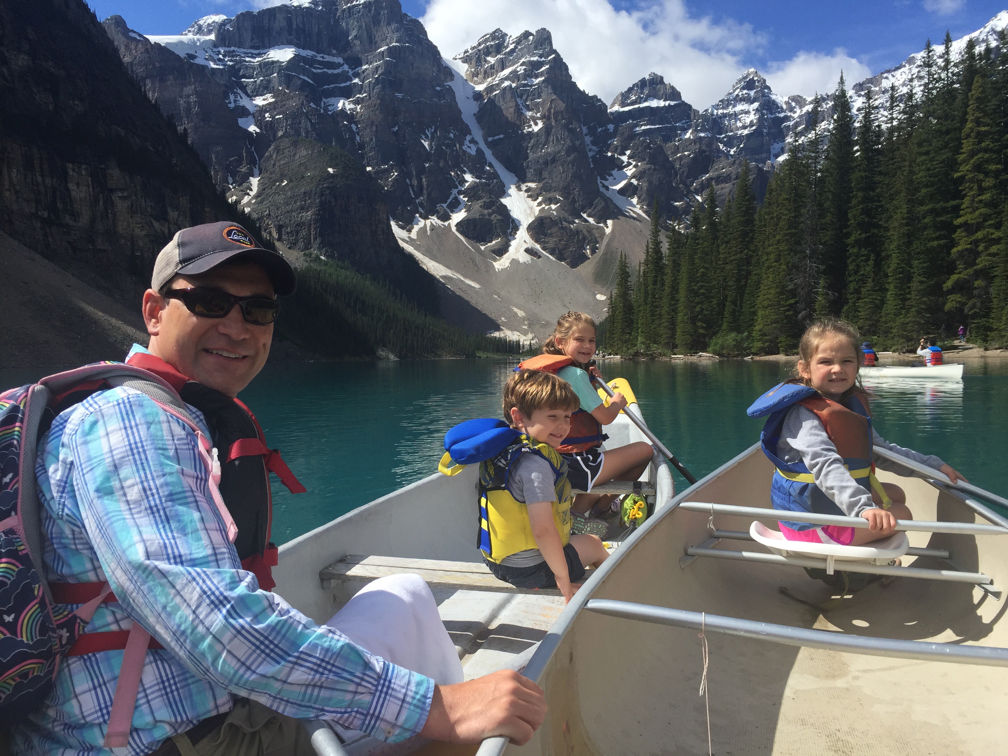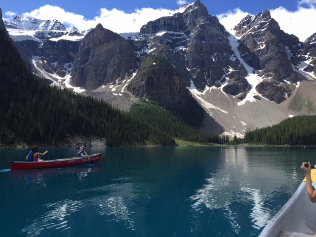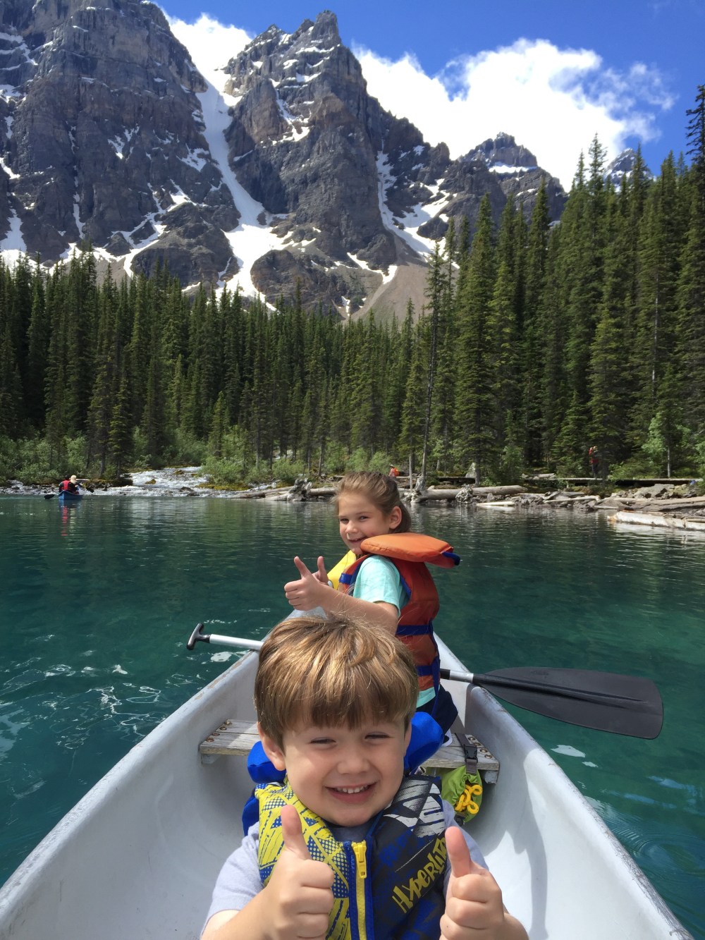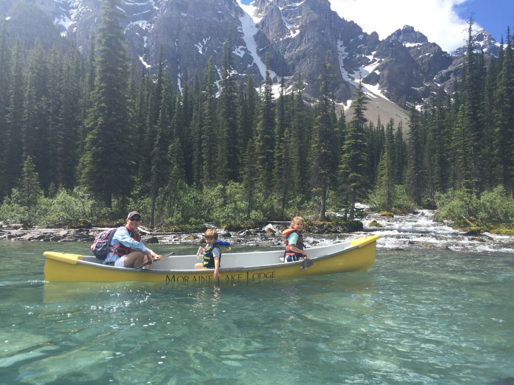 The next day, we promised the kids no hiking and meant it. Instead, we drove to Lake Moraine, west of Lake Louise, and got in two canoes. Andrew was in a boat with Claire and Peter, while Elizabeth and I teamed up.