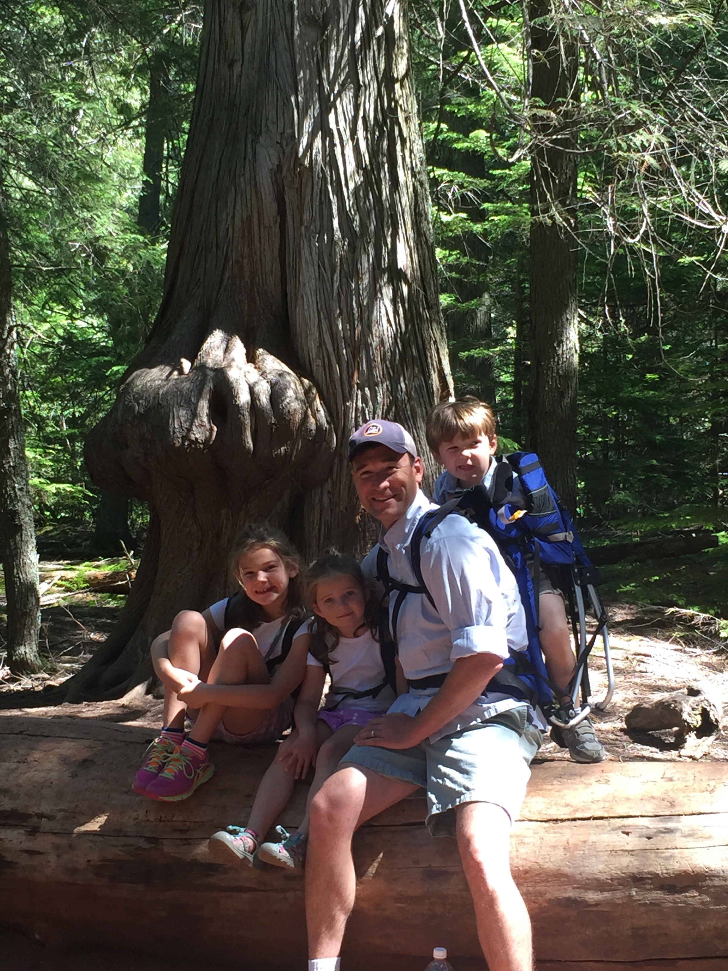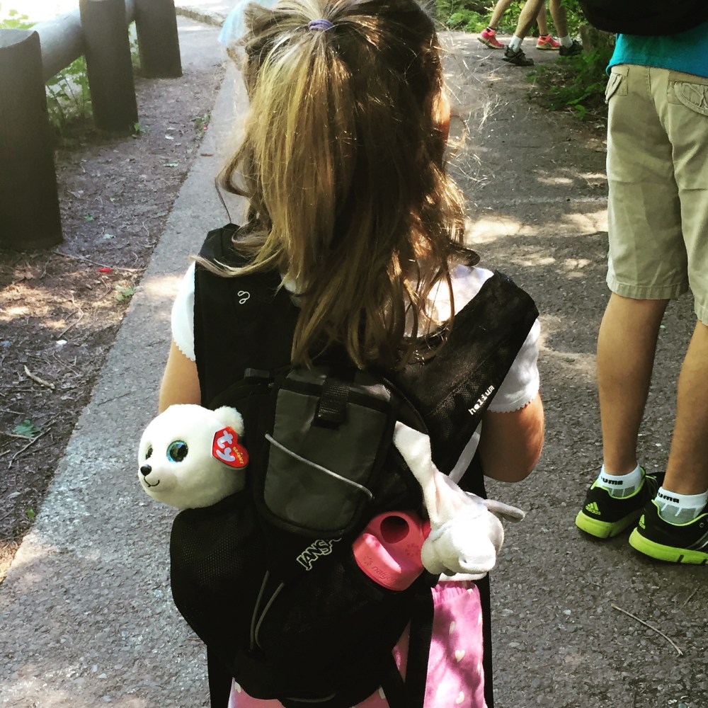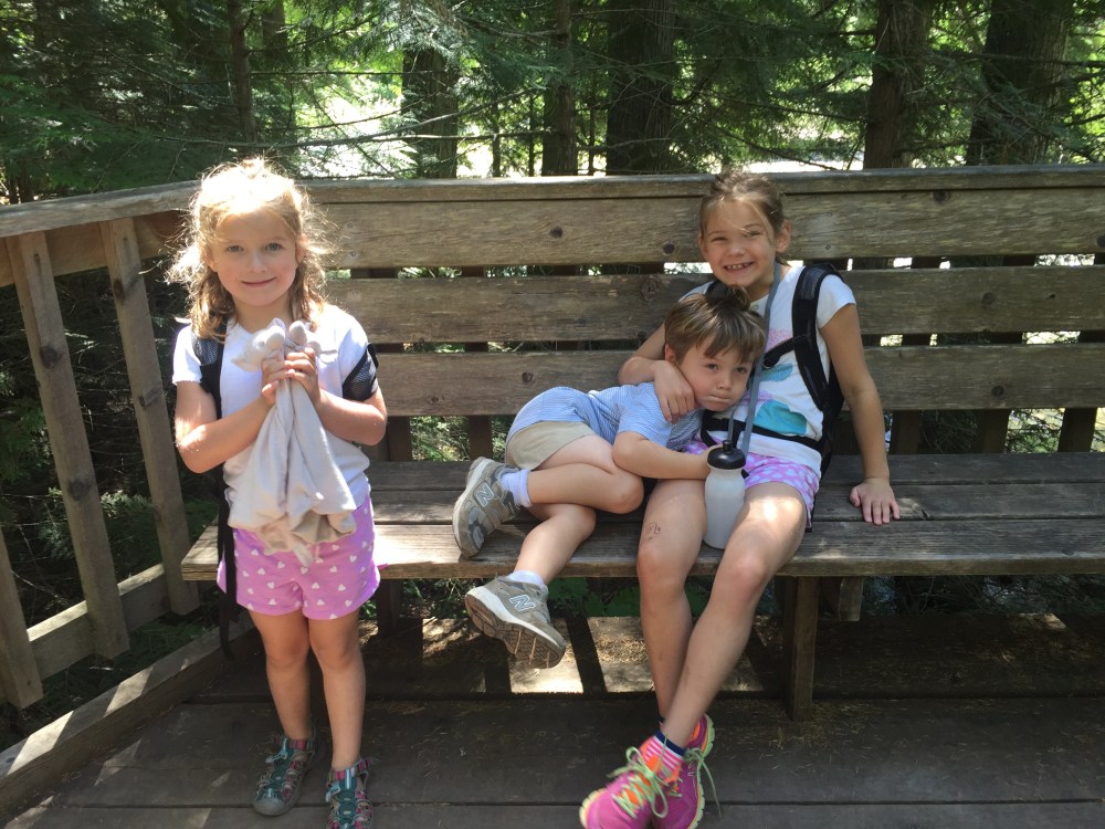 Never mind, we did it with the help of a borrowed hiking backpack and tougher kids than we realized we had – as well as the sleeping grizzly bear we spied in the woods less than 50 yards from the trail. (We had bear spray and were prepared to use it.) We were relieved to reach the top with no more bear sightings, and that he/she had moved deeper into the forest by the time we were making our descent.