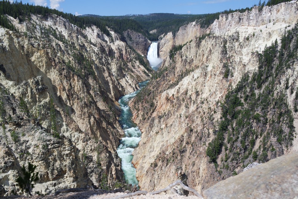 After stopping to see a few steam vents and the hot spring that cascades Devil’s Thumb, our first stop was Yellowstone Canyon, or, “the Grand Canyon of Yellowstone” into which a massive waterfall pours. The Yellowstone River is the most peaceful part of this highly active volcano, and although it’s not the focal point of this park, the canyon itself is pretty impressive.