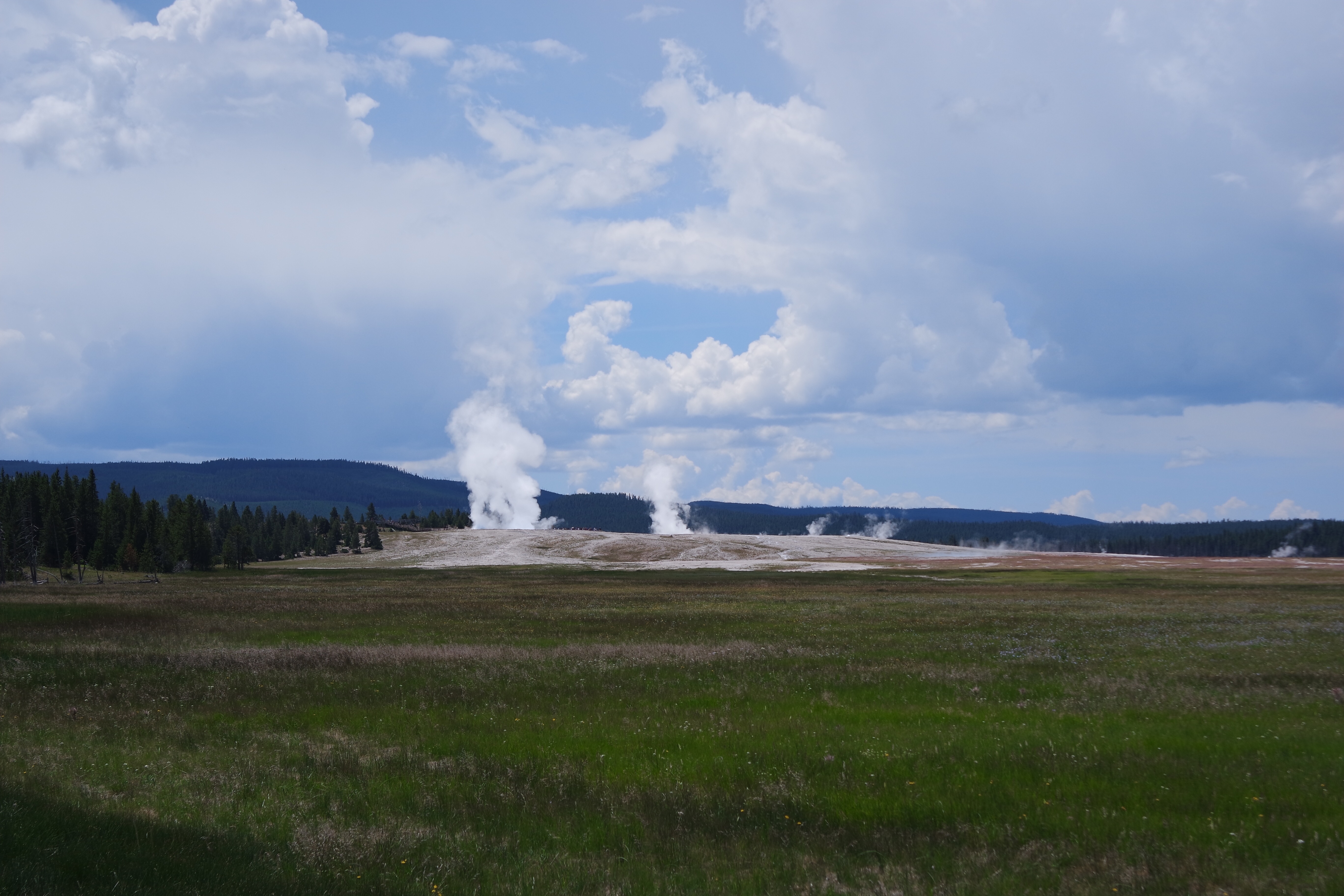 We made it to the ranger talk just in time. At the end of it, though, a storm broke and officials emptied the seats near the geyser due to concerns about lightning. It would have been more fun to see Old Faithful blow outdoors, but the sheltered viewing window was much drier and safer. The geyser’s explosion was worth the wait, and the kids had fun predicting when it would happen.