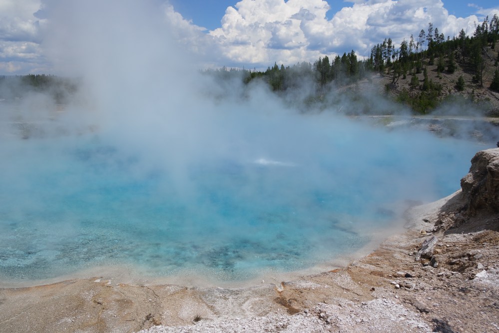 Peter fell asleep on the way to the Grand Prismatic Spring, but woke up just in time to get out of the car and see it. The pools around the spring itself are eerie, steaming and bubbling like cauldrons. By comparison, and if it weren’t so obviously dangerous, with hot steam rising up and covering it like a blanket of fog, the prismatic spring is quieter and even pretty, as its yellow, orange and red outer edges give way to green and turquoise in the middle.